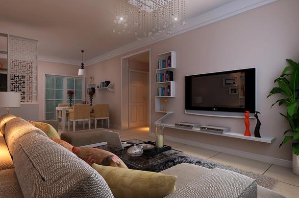 電視背景墻是一面收納柜,內嵌式的裝扮,白色的粉飾,讓它顯得簡約大方。